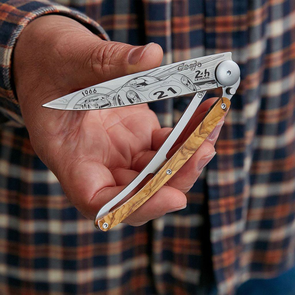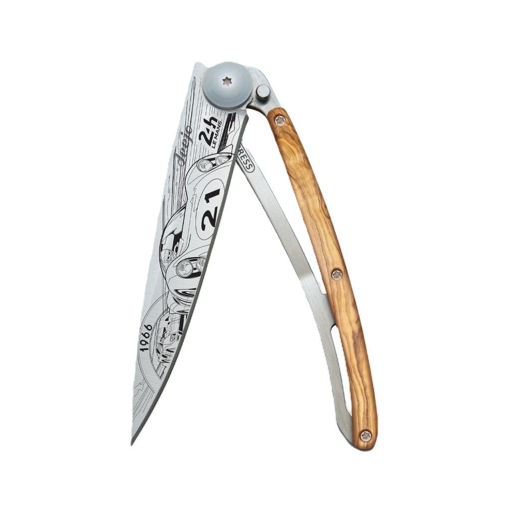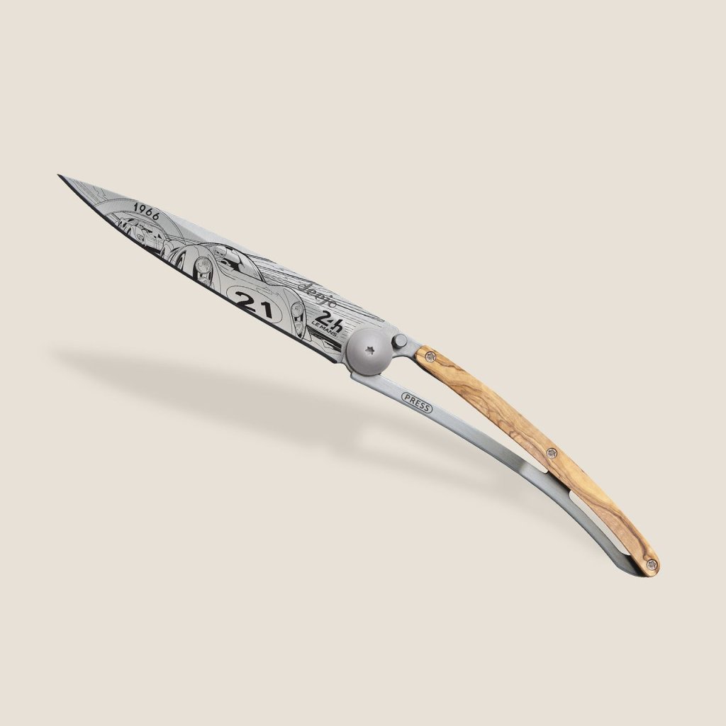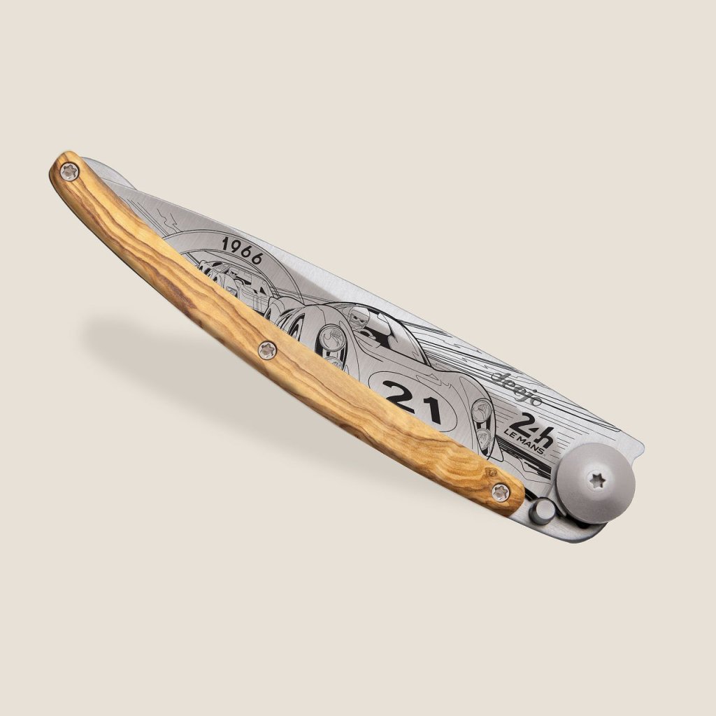 Stylový ultralehký nůž Deejo se střenkou z olivového dřeva a motivem 24 h Le Mans 1966.