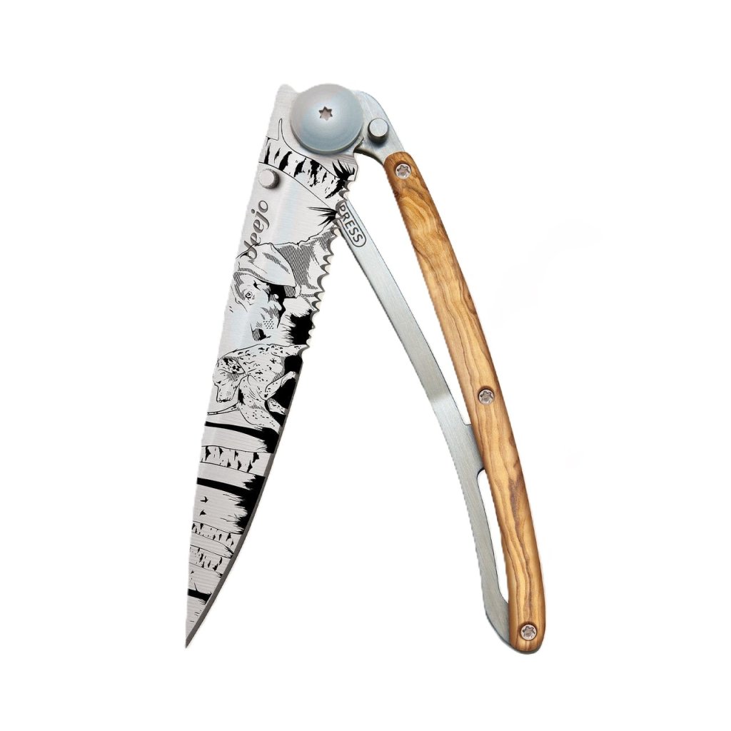 Kapesní nůž Deejo Tattoo Serration 37g olive wood Hunting Day