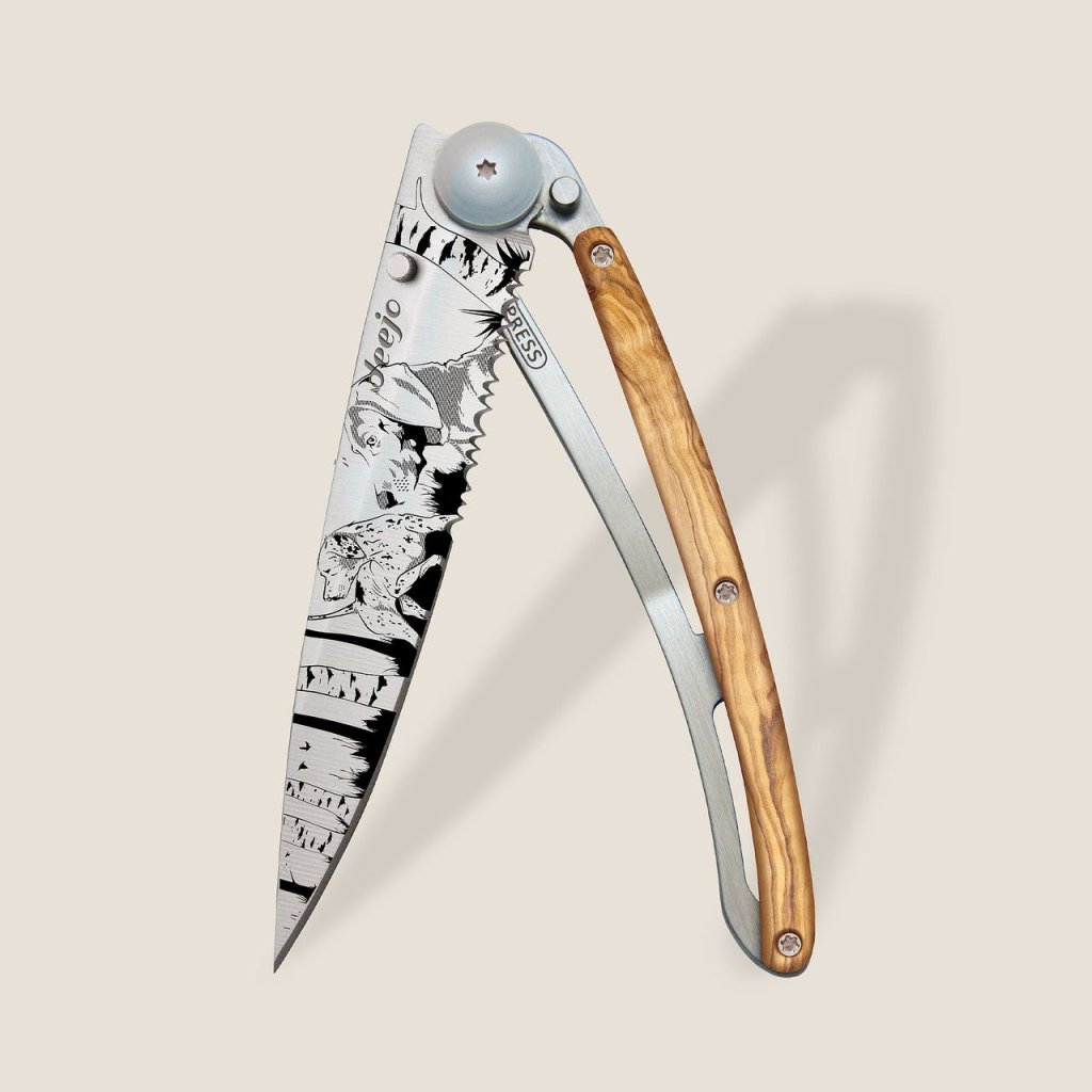 Elegantní matný titanový povrch je trvale gravírován laserem. Pro zachování ostrosti i tetovaného motivu používejte k dobrušování kapesní brousek deejo. Zoubkaté ostří.