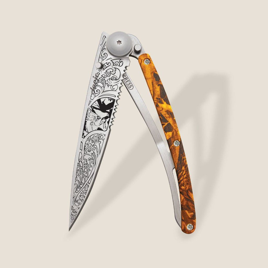 Stylový ultralehký nůž Deejo se střenkou z hliníku a tetováním sluky lesní. Nůž z kolekce Serration vybavený zubatým ostřím pro snadnější řezání lan a provazů.