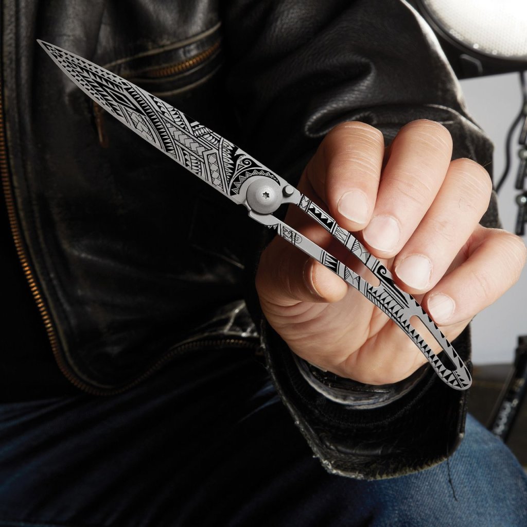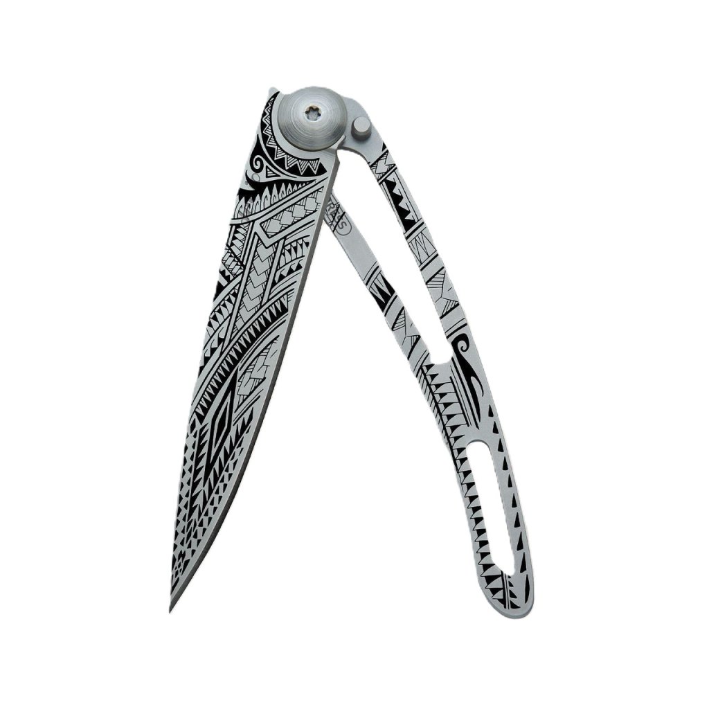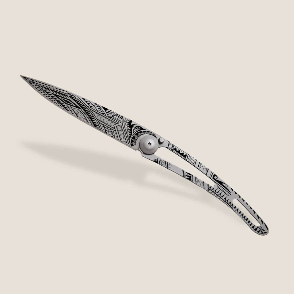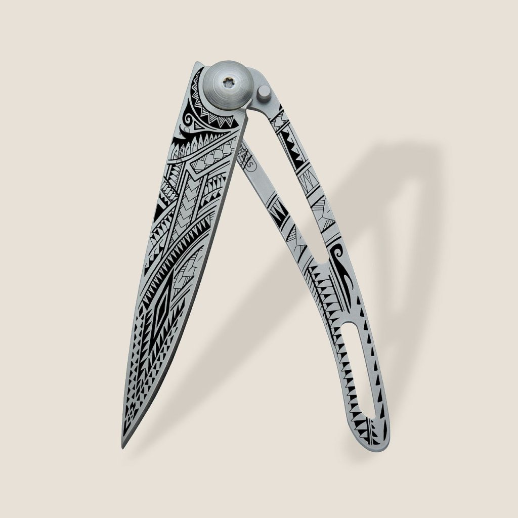 Stylový ultralehký nůž Deejo ze série Naked o hmotnosti 37 gramů, s čepelí s polynéským tetováním pe’a.