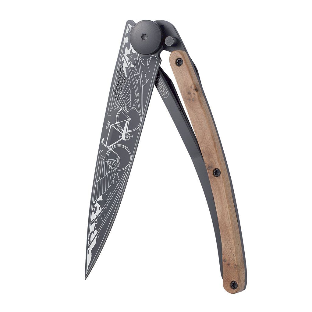 Stylový ultralehký nůž Deejo z kolekce Tattoo Black se střenkou z kořene exotického jalovce a tetováním "Bicycle".