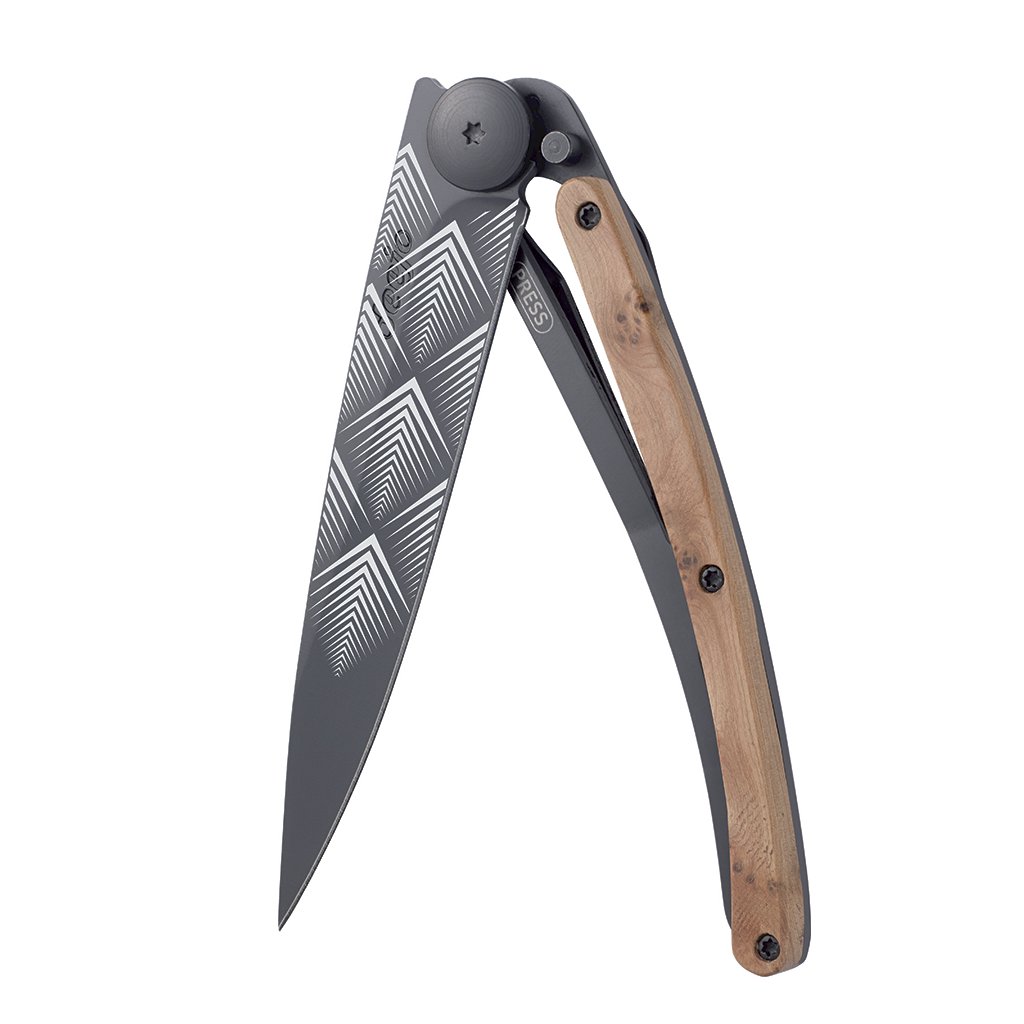Stylový ultralehký nůž Deejo z kolekce Tattoo Black se střenkou z kořene exotického jalovce a tetováním "Art Déco".