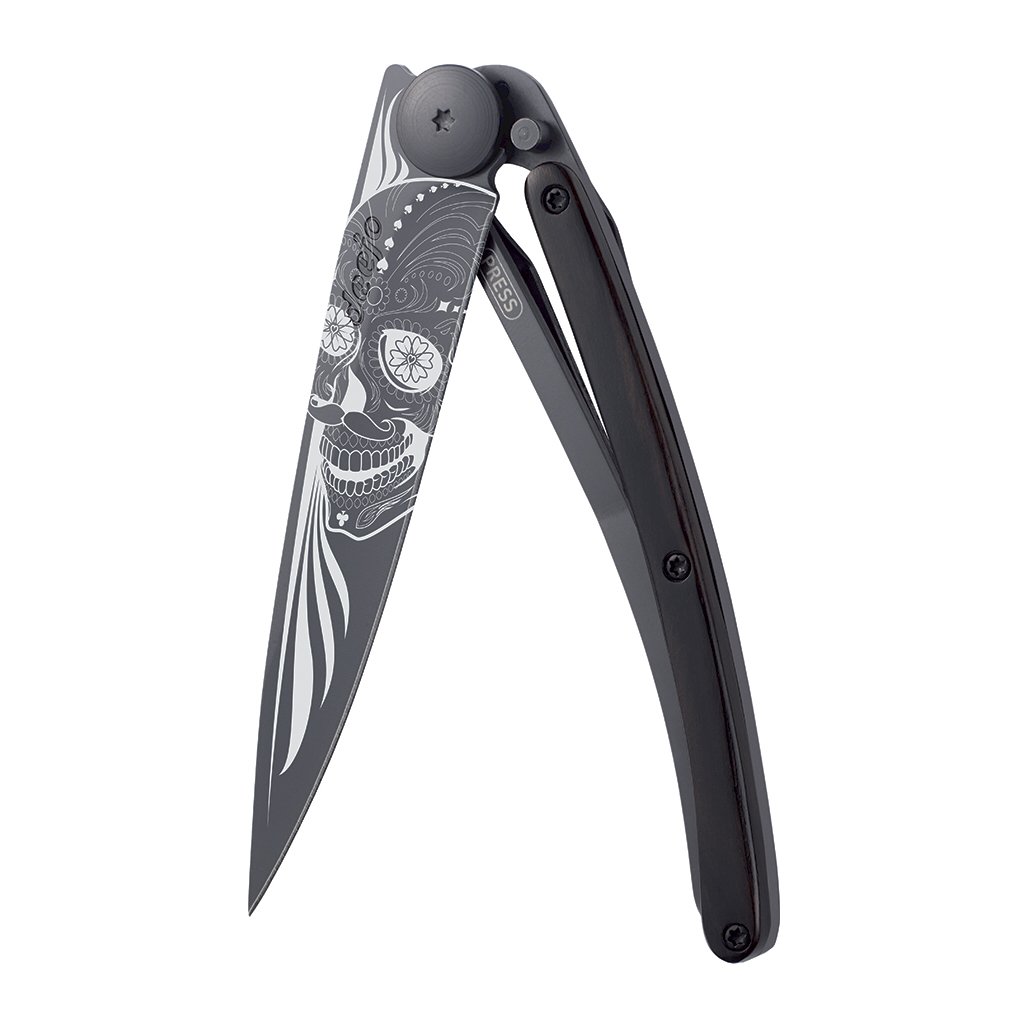 Stylový ultralehký nůž Deejo z kolekce Biker se střenkou z kořene exotického ebenového dřeva a motivem "lebky".