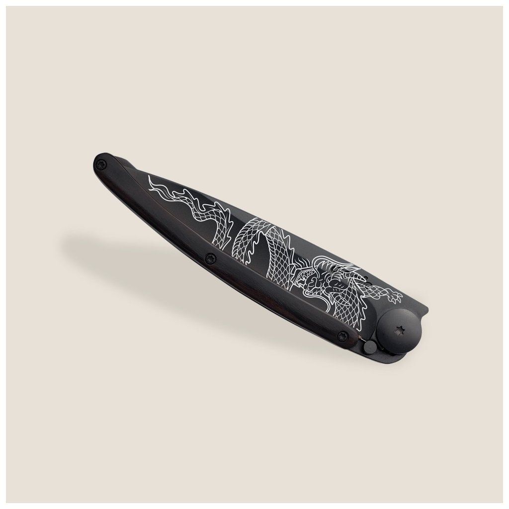 Stylový ultralehký nůž Deejo se střenkou z kořene exotického ebenového dřeva a tetováním "japonský drak".