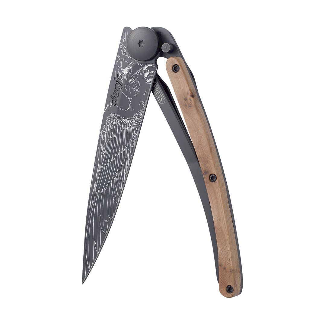 Stylový ultralehký nůž Deejo z kolekce Tattoo Biker se střenkou z kořene exotického jalovce a tetováním "orel".