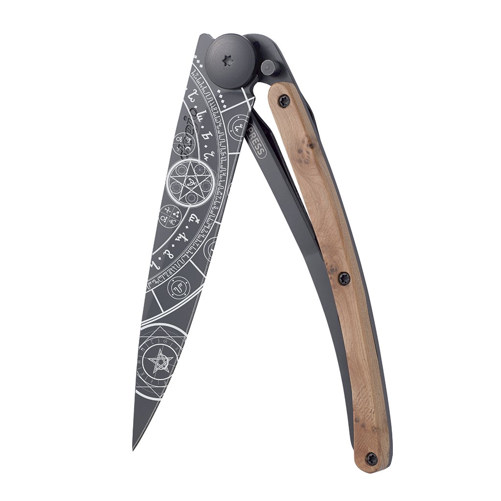 Stylový ultralehký nůž Deejo z kolekce Tattoo Fantasy se střenkou z kořene exotického jalovce a tetováním "Esoteric".