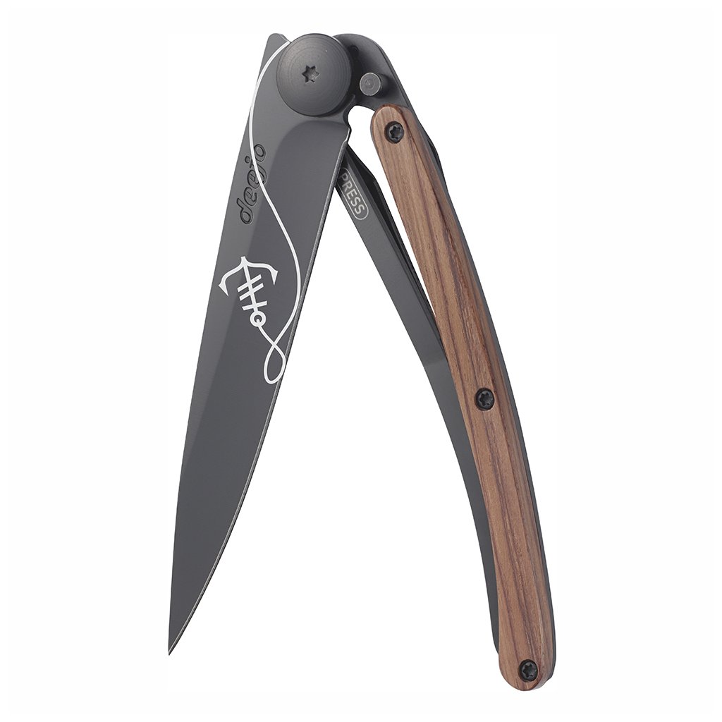 Stylový ultralehký nůž Deejo z kolekce Ocean se střenkou z exotického dřeva coralwood a tetováním "kotva".