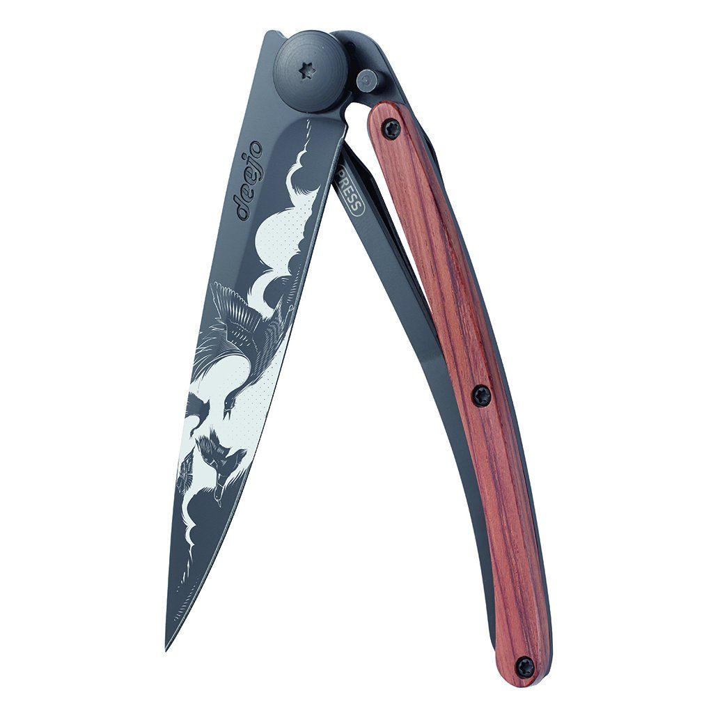 Stylový ultralehký nůž Deejo se střenkou z exotického dřeva coralwood a tetováním "let".