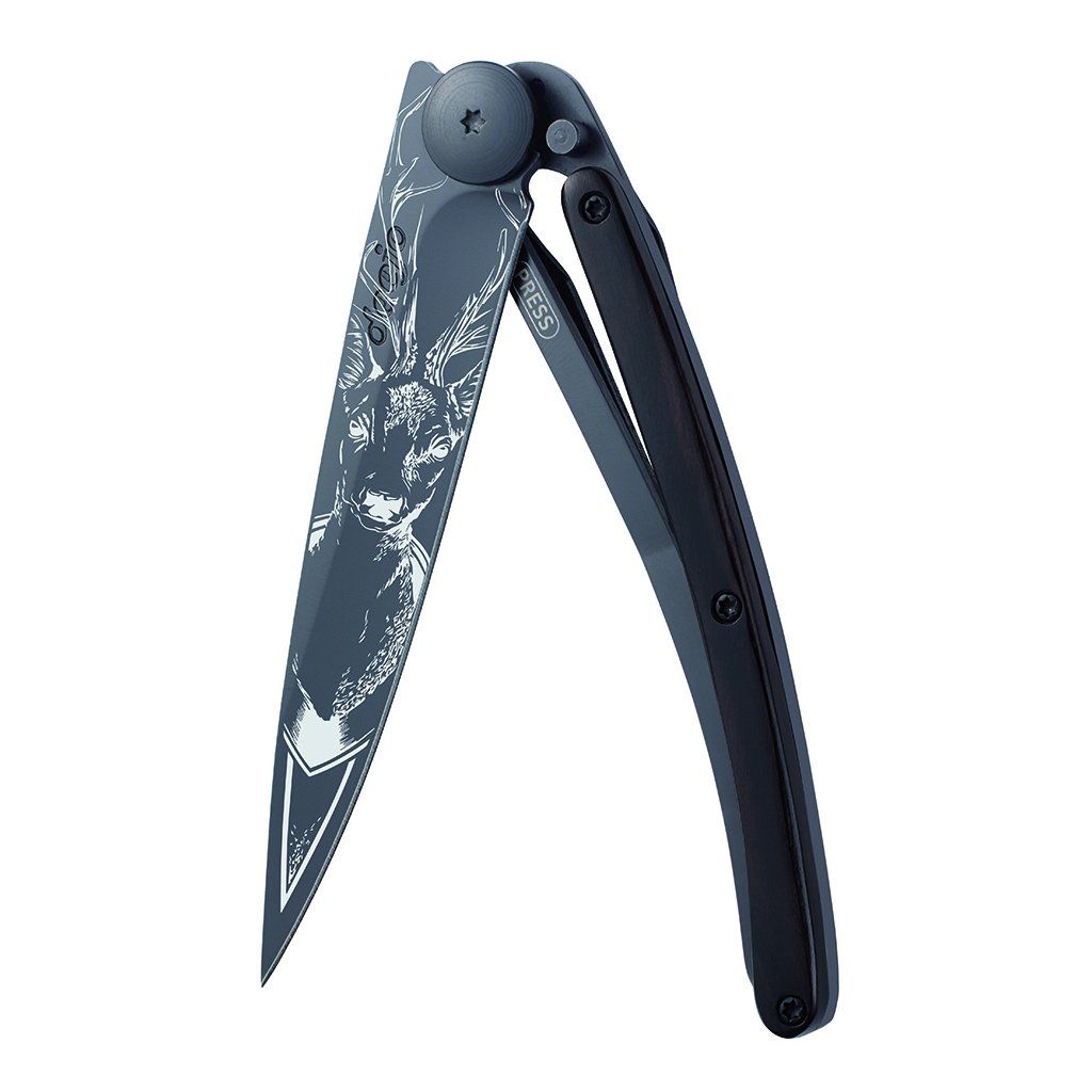 Stylový ultralehký nůž Deejo z kolekce Nature se střenkou z kořene exotického ebenového dřeva a tetováním "jelen".