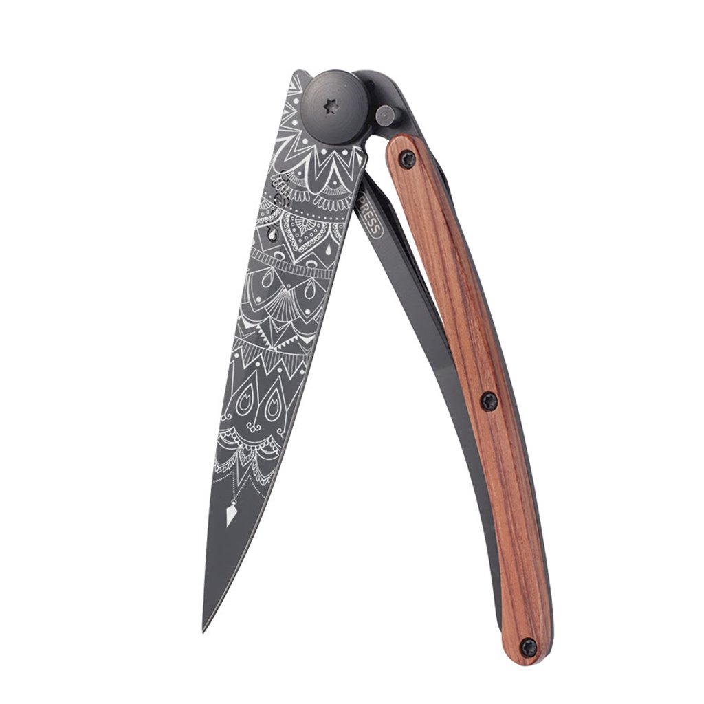 Stylový ultralehký nůž Deejo se střenkou z exotického dřeva coralwood a tetováním "mandala".
