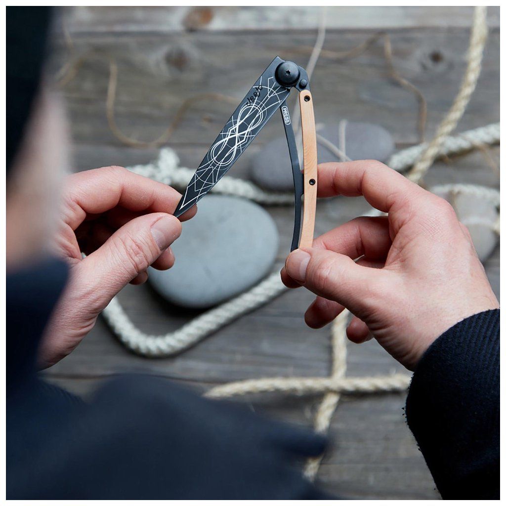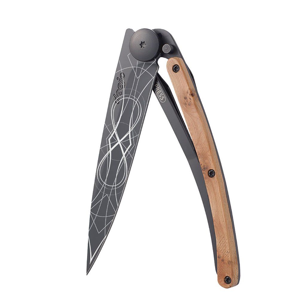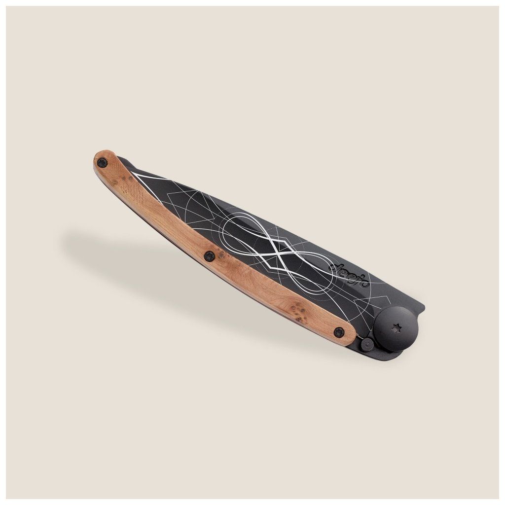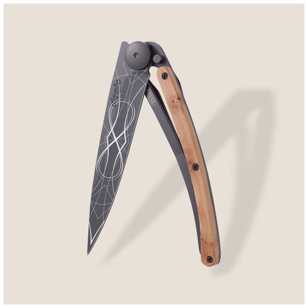 Stylový ultralehký nůž Deejo z kolekce Tattoo Black se střenkou z kořene exotického jalovce a tetováním "nekonečno".