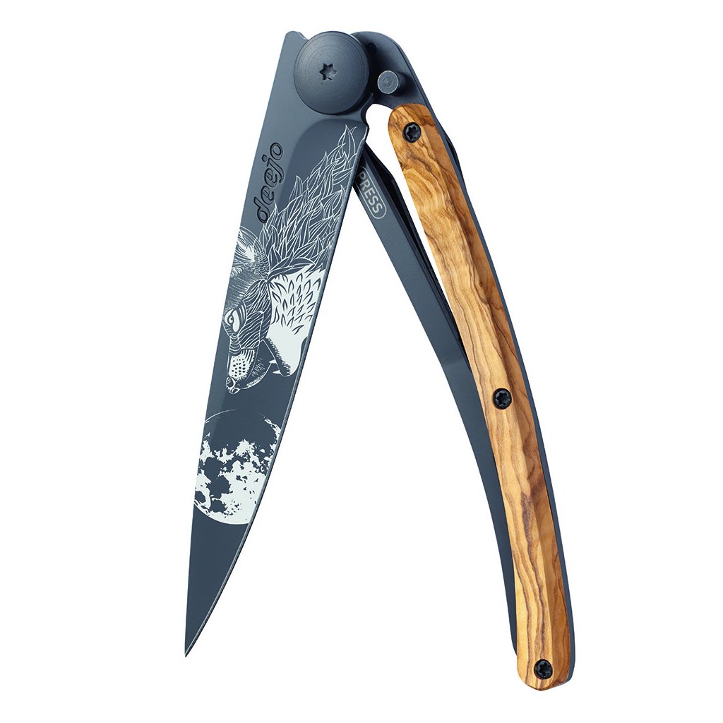 Stylový ultralehký nůž Deejo se střenkou z olivového dřeva a motivem "howling".