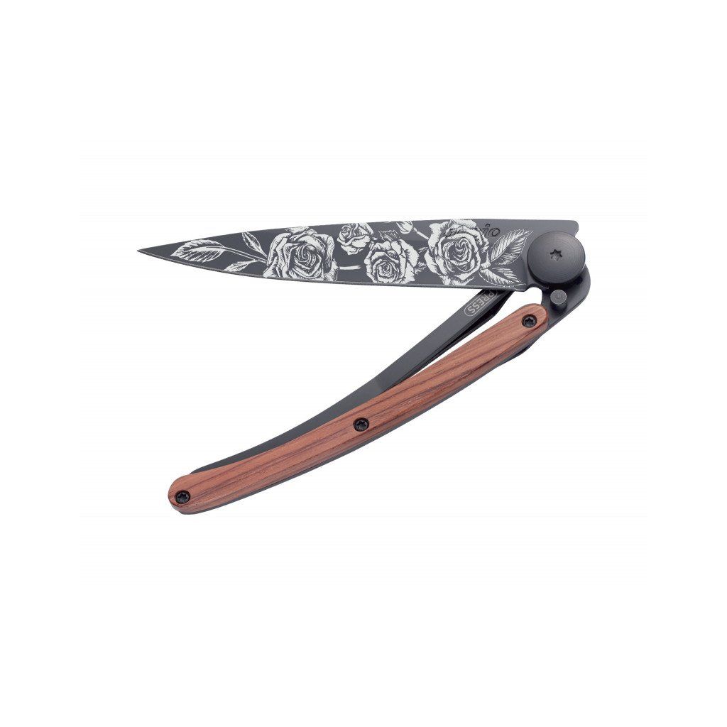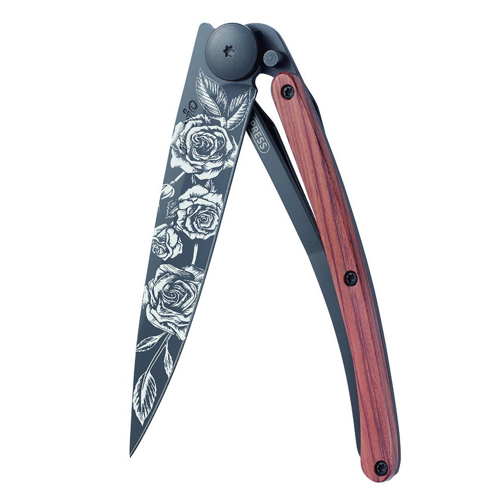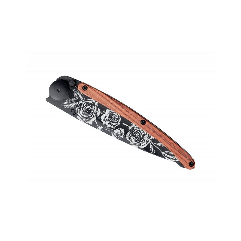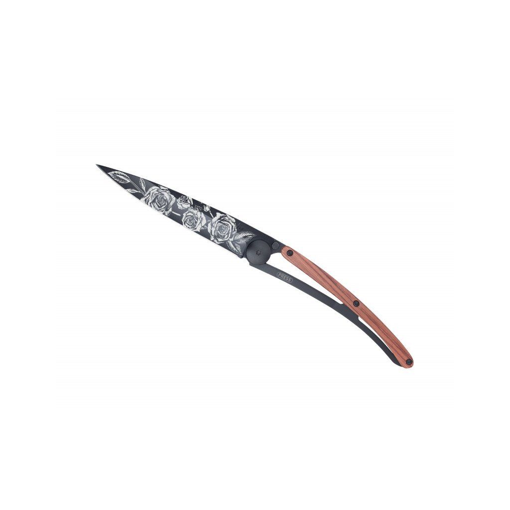 Stylový ultralehký nůž Deejo se střenkou z exotického dřeva coralwood a motivem "růže".
