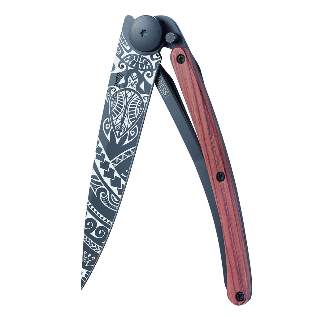 Stylový ultralehký nůž Deejo se střenkou z exotického dřeva coralwood a motivem "Polynésie".