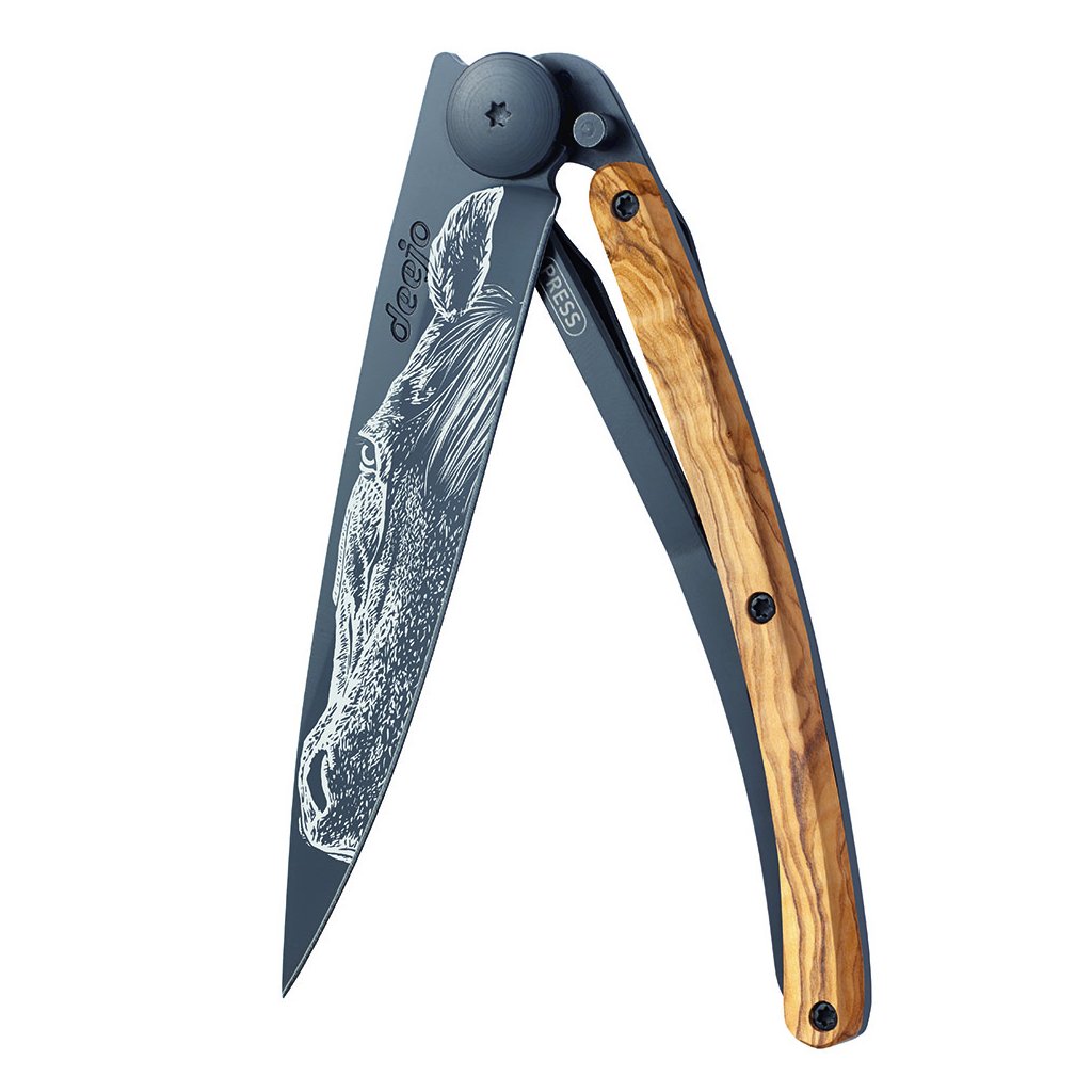 Stylový ultralehký nůž Deejo se střenkou z olivového dřeva a motivem "warmblood".