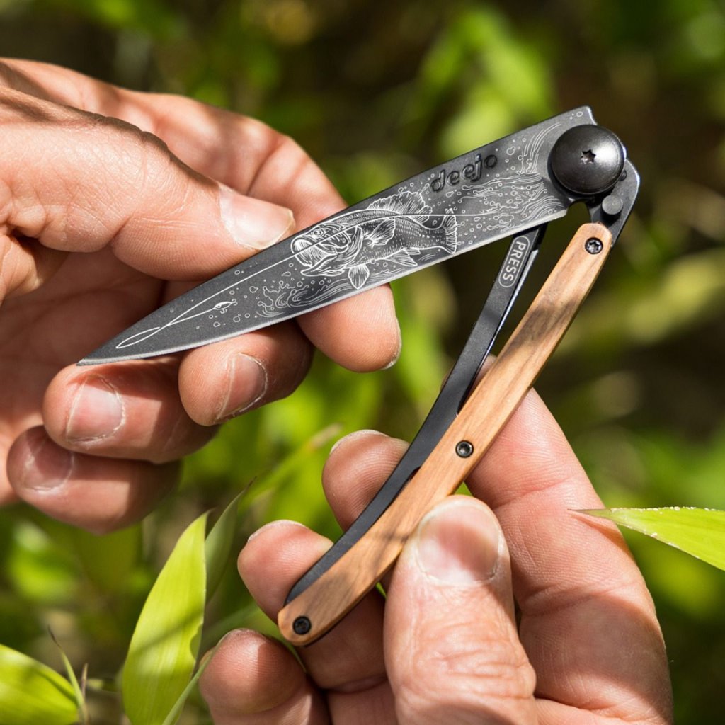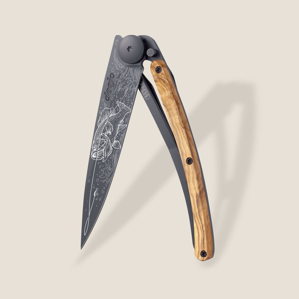 Stylový ultralehký nůž Deejo se střenkou z olivového dřeva a motivem okouna.