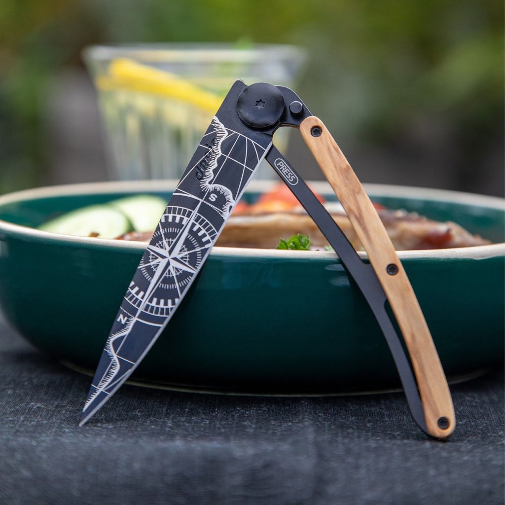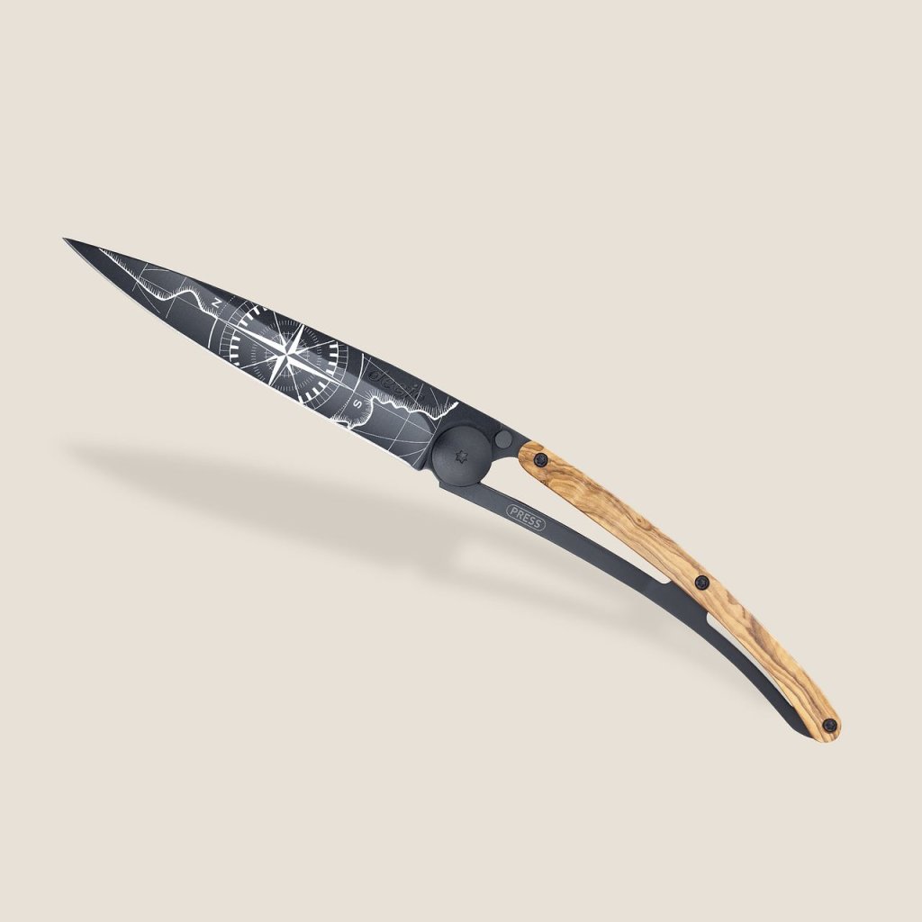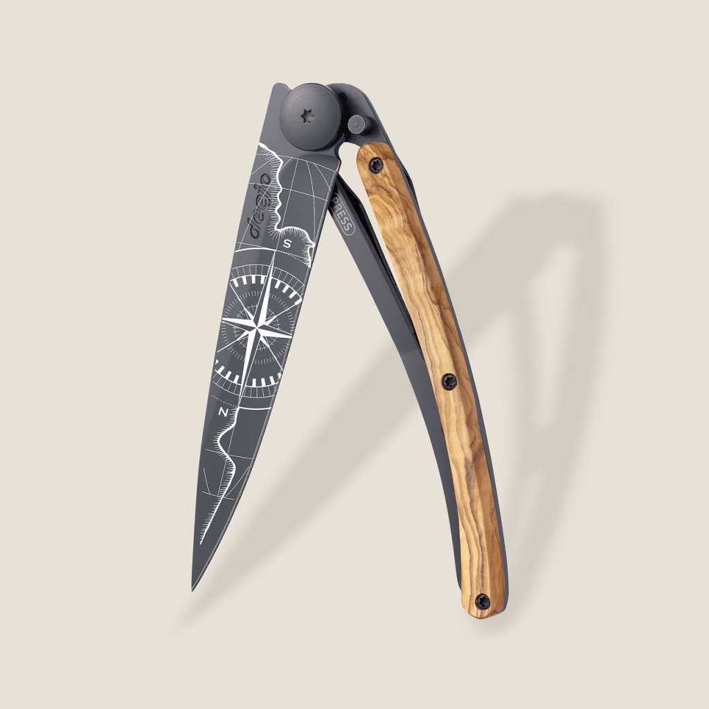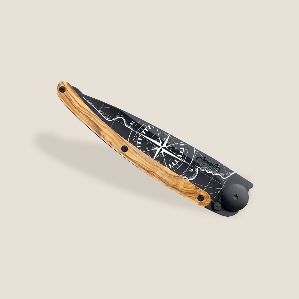 Stylový ultralehký nůž Deejo se střenkou z olivového dřeva a geomotivem.