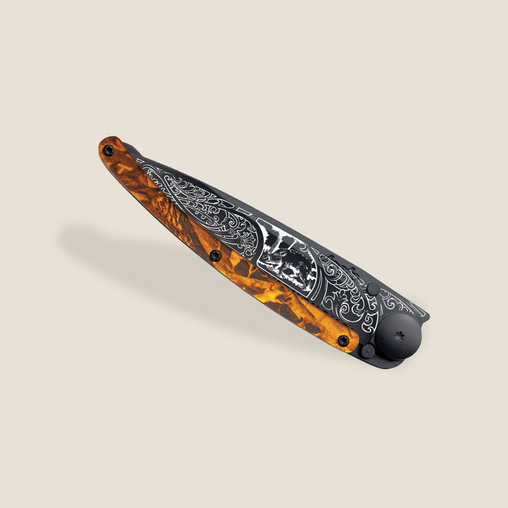Kapesní nůž Deejo Tattoo Serration Black 37g orange camo Wild Boar