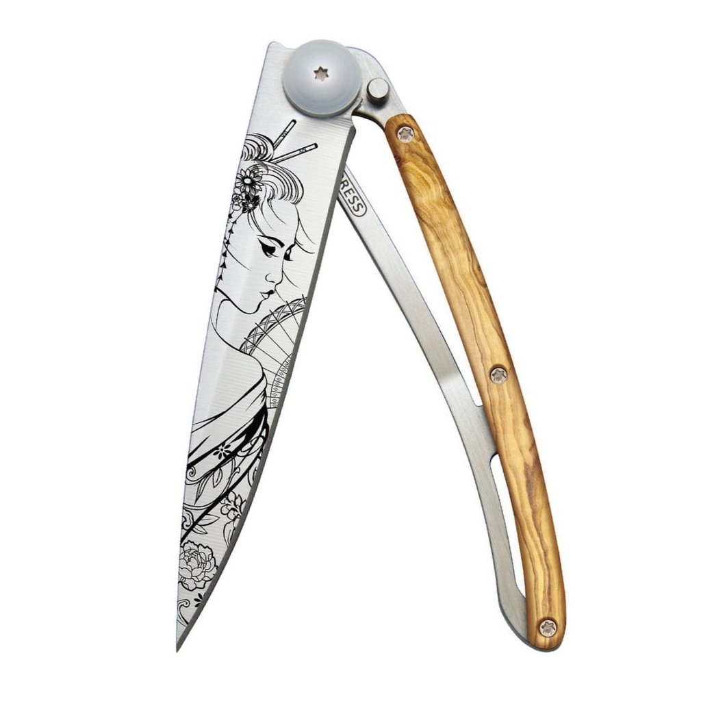 Stylový ultralehký nůž Deejo se střenkou z olivového dřeva a motivem "gejša".
