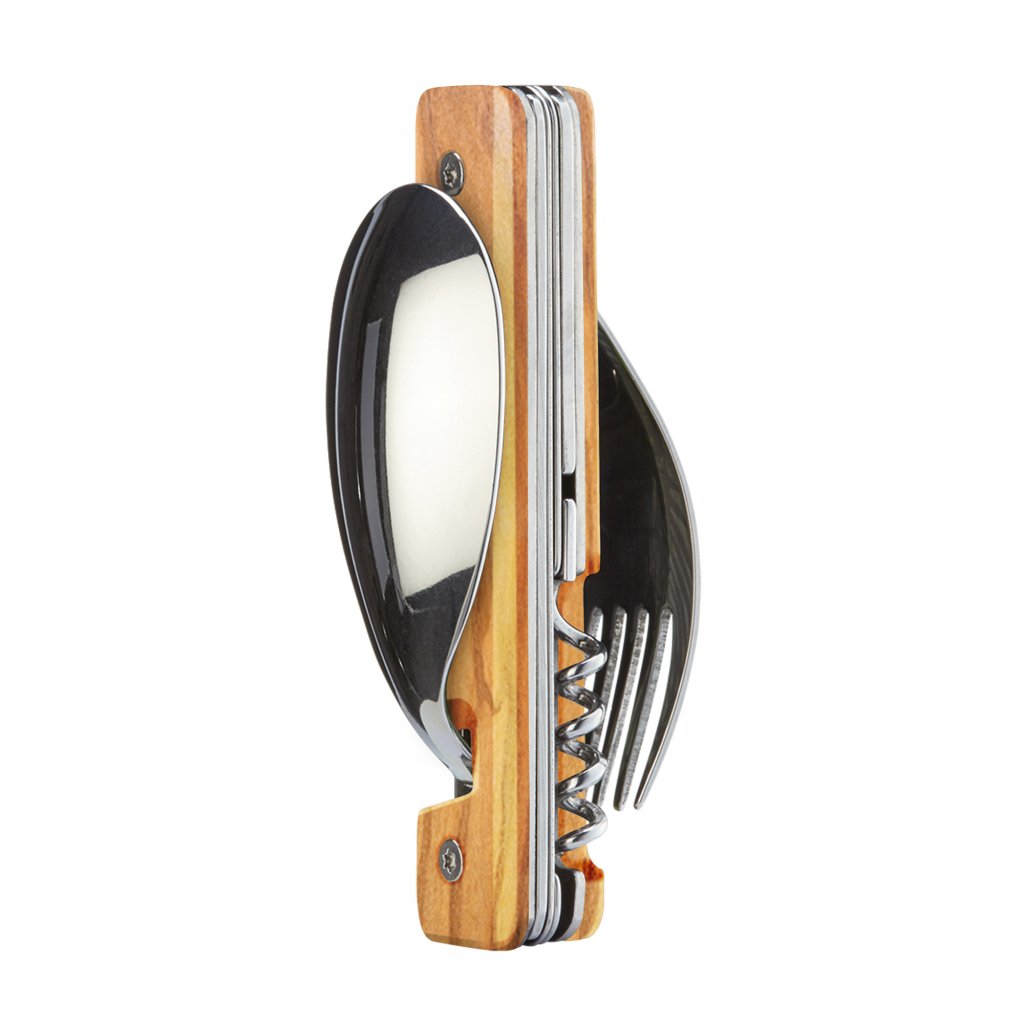 Příborový skládací set Akinod povyšuje stolování kdekoliv na zážitek. V kapesním nástroji najdete několik potřebných pomocníků: nůž se zubatým ostřím, který si poradí s masem i měkkou zeleninou, plnohodnotnou vidličku, dokonale tvarovanou lžíci, výkonnou vývrtku, otvírák plechovek a otvírák korunkových uzávěrů lahví.