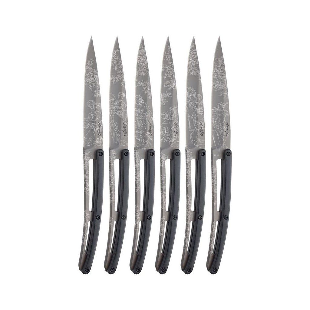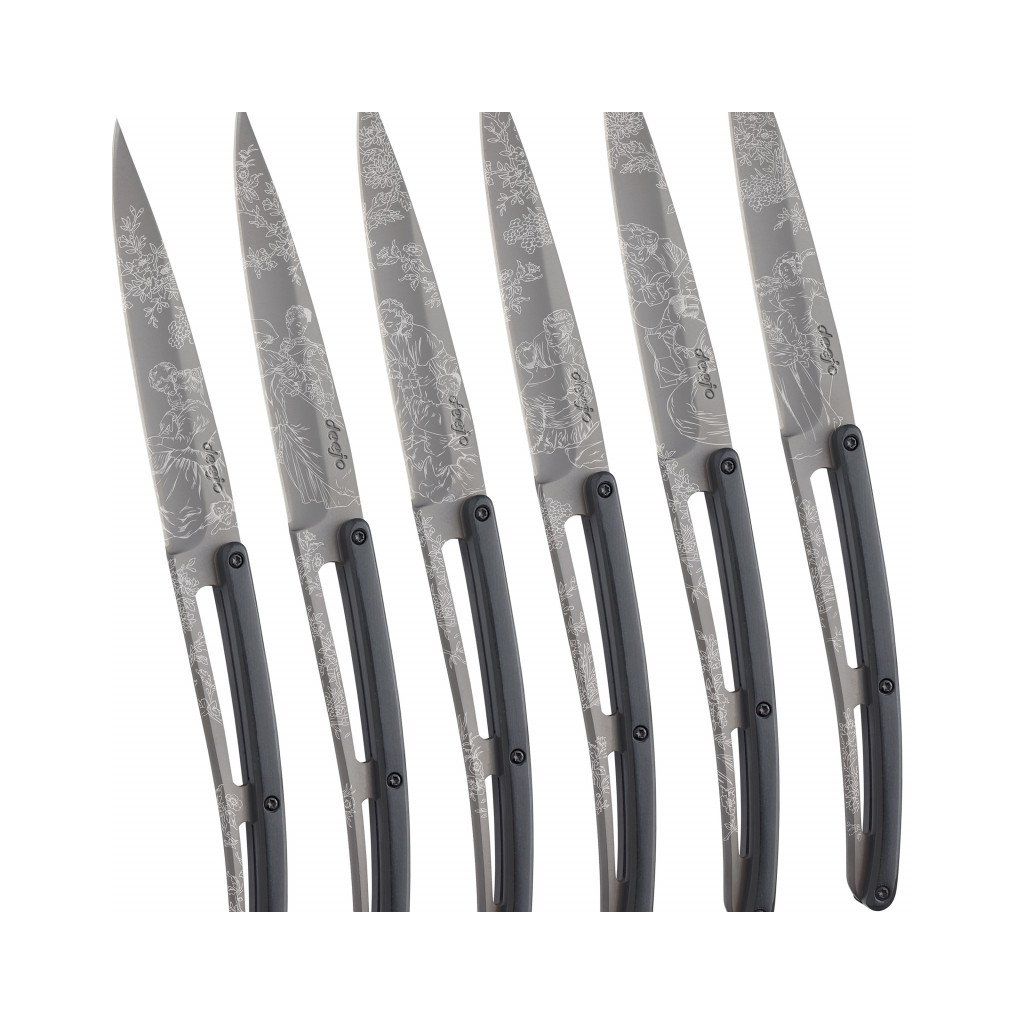 Sada stylových jídelních nožů s matným designem čepelí "Toile de Jouy" a střenkou z plastu ABS v černé barvě.
