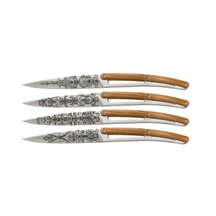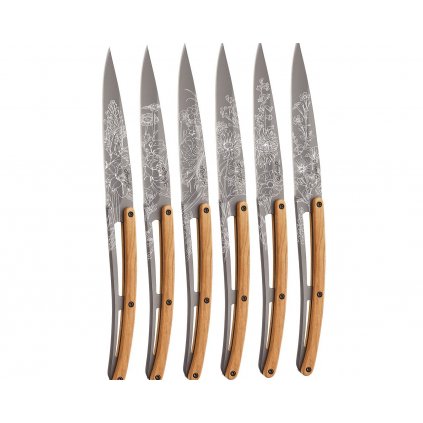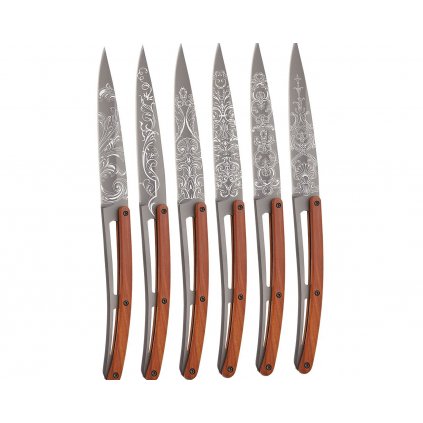 Stolní nože v jedinečném luxusním designu. Štíhlá silueta nože, jemná střenka umístěná v horní části nože umožňuje pohodlný úchop. Steakové nože deejo najdete v mnoha variacích, ať už jde o povrchovou úpravu, typ ostří, materiál střenky nebo motiv tetování. Skvělá sada nožů je dokonalým dárkem, kromě konzumace steaků využijete nože i pro stylové prostření rodinné večeře nebo oslavy s přáteli – sada obsahuje hned 6 ostrých nožů. Baleno v dárkové kartonové krabičce, kterou využijete i pro bezpečné uložení mezi používáním.